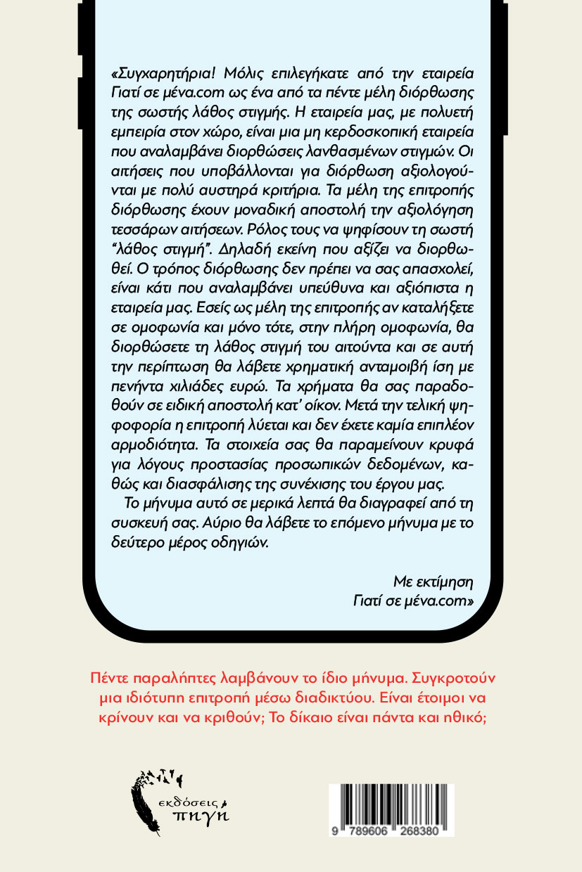 «Συγχαρητήρια! Μόλις επιλεγήκατε από την εταιρεία Γιατί σε µένα.com ως ένα από τα πέντε µέλη διόρθωσης της σωστής λάθος στιγµής. Η εταιρεία µας, µε πολυετή εµπειρία στον χώρο, είναι µια µη κερδοσκοπική εταιρεία που αναλαµβάνει διορθώσεις λανθασµένων στιγµών. Οι αιτήσεις που υποβάλλονται για διόρθωση αξιολογούνται µε πολύ αυστηρά κριτήρια. Τα µέλη της επιτροπής διόρθωσης έχουν µοναδική αποστολή την αξιολόγηση τεσσάρων αιτήσεων. Ρόλος τους να ψηφίσουν τη σωστή “λάθος στιγµή”. Δηλαδή εκείνη που αξίζει να διορθωθεί. Ο τρόπος διόρθωσης δεν πρέπει να σας απασχολεί, είναι κάτι που αναλαµβάνει υπεύθυνα και αξιόπιστα η εταιρεία µας. Εσείς ως µέλη της επιτροπής αν καταλήξετε σε οµοφωνία και µόνο τότε, στην πλήρη οµοφωνία, θα διορθώσετε τη λάθος στιγµή του αιτούντα και σε αυτή την περίπτωση θα λάβετε χρηµατική ανταµοιβή ίση µε πενήντα χιλιάδες ευρώ. Τα χρήµατα θα σας παραδοθούν σε ειδική αποστολή κατ’ οίκον. Μετά την τελική ψηφοφορία η επιτροπή λύεται και δεν έχετε καµία επιπλέον αρµοδιότητα. Τα στοιχεία σας θα παραµείνουν κρυφά για λόγους προστασίας προσωπικών δεδοµένων, καθώς και διασφάλισης της συνέχισης του έργου µας.