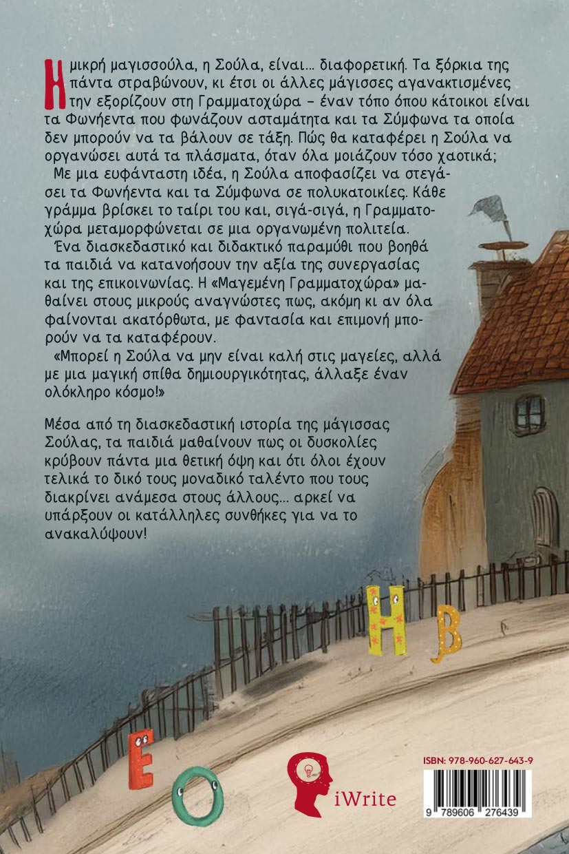 Η μικρή μαγισσούλα, η Σούλα, είναι… διαφορετική. Τα ξόρκια της πάντα στραβώνουν, κι έτσι οι άλλες μάγισσες αγανακτισμένες την εξορίζουν στη Γραμματοχώρα – έναν τόπο όπου κάτοικοι είναι τα Φωνήεντα που φωνάζουν ασταμάτητα και τα Σύμφωνα τα οποία δεν μπορούν να τα βάλουν σε τάξη. Πώς θα καταφέρει η Σούλα να οργανώσει αυτά τα πλάσματα, όταν όλα μοιάζουν τόσο χαοτικά;