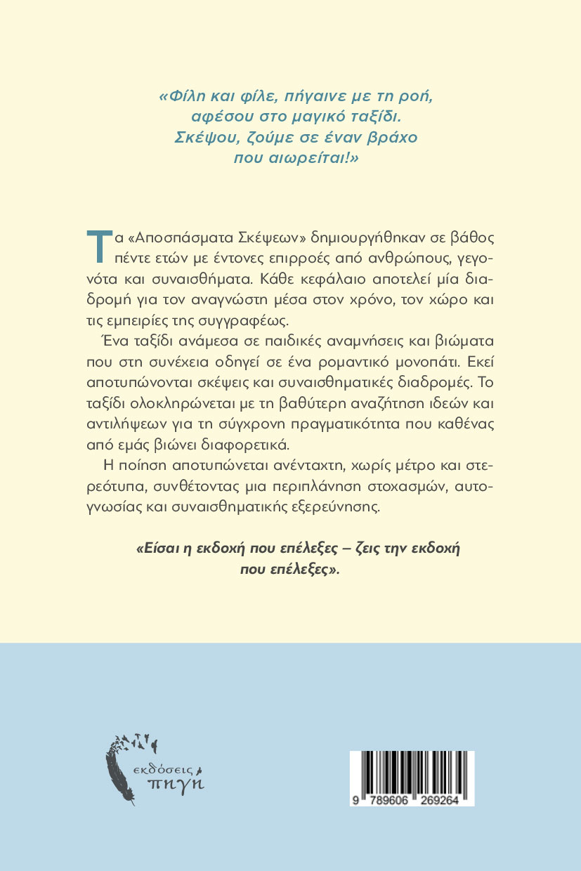 Η ποιητική συλλογή «Αποσπάσματα Σκέψεων» δημιουργήθηκαν σε βάθος πέντε ετών με έντονες επιρροές από ανθρώπους, γεγονότα και συναισθήματα. Κάθε κεφάλαιο αποτελεί μία διαδρομή για τον αναγνώστη μέσα στον χρόνο, τον χώρο και τις εμπειρίες της συγγραφέως.