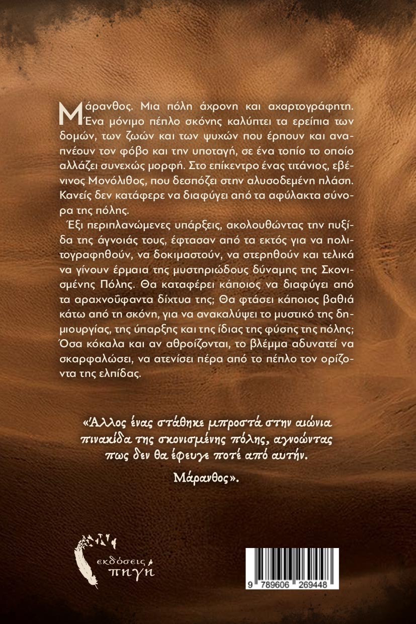 Μάρανθος. Μια πόλη άχρονη και αχαρτογράφητη. Ένα μόνιμο πέπλο σκόνης καλύπτει τα ερείπια των δομών, των ζωών και των ψυχών που έρπουν και αναπνέουν τον φόβο και την υποταγή, σε ένα τοπίο το οποίο αλλάζει συνεχώς μορφή. Στο επίκεντρο ένας τιτάνιος, εβένινος Μονόλιθος, που δεσπόζει στην αλυσοδεμένη πλάση. Κανείς δεν κατάφερε να διαφύγει από τα αφύλακτα σύνορα της πόλης.